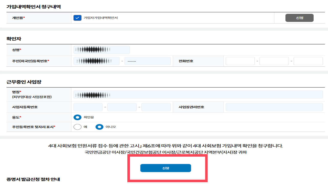 4단계: 가입내역확인서 신청 정보 입력