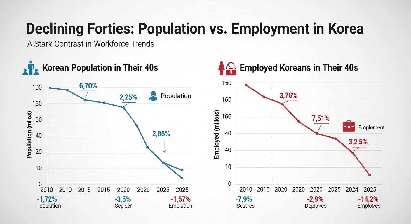 - 통계에 속지 마라: 40대 실업률(1.7%)이 낮아 보이는 것은 '인구 감소' 때문. 실제 취업자 수는 22개월째 급감 중이다.
